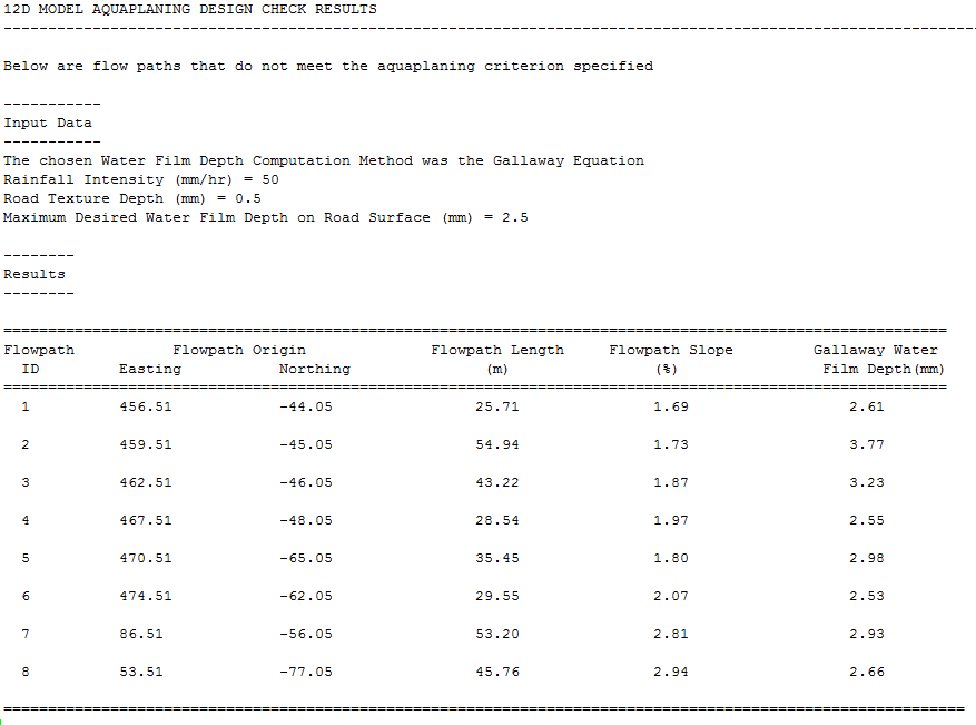 For this example, the Gallaway equation will be used, so select Gallaway equation from the first dialogue. Next, enter a Design Rainfall, say 50 (mm/hr). You are then required to enter a roadway texture depth, say 0.5 (mm). A maximum water film depth then needs to be specified, say 2.5 (mm). The script will then carry out all necessary calculations (including the creating of flowpath slope, length and depth grids), and at the completion of the calculations, a save dialogue will appear allowing the user to select a location to save a text file detailing the flowpath details that exceed the maximum water film depth threshold set earlier.