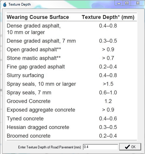 The first input required is to choose between the Gallaway equation and the RRL Method. Once an appropriate method is chosen, input of a uniform design rainfall intensity is required. Next, the user is required to enter an appropriate wearing surface texture depth (only if Gallaway equation is being used), and the below image is provided to the user to allow the appropriate selection of the texture depth.