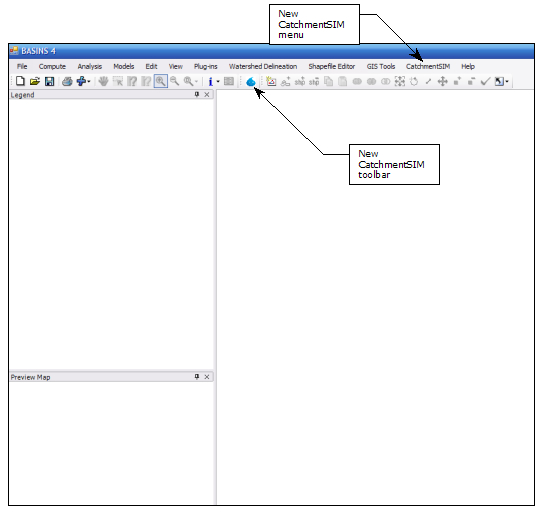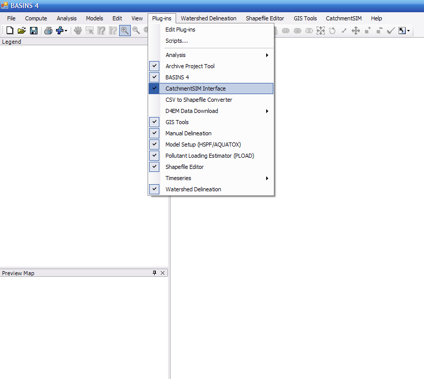 Version 4 of BASINS was developed using an open source GIS software architecture (MapWindow). The MapWindow interface includes an extensible architecture that allows plug-in's to be developed and incorporated within BASINS/MapWindow to provide additional functionality. A BASINS CatchmentSIM plug-in has been developed to allow data (i.e., DEMs, watercourse, land use and soils information) that is automatically downloaded in BASINS to be exported and used to automatically setup a new CatchmentSIM project. A description of the plug-in and how to use the plug-in to setup a new CatchmentSIM project is described below.