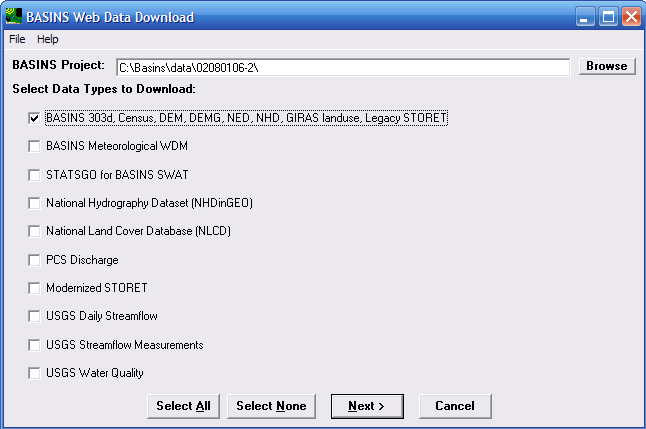 BASINS incorporates an automated data download facility to setup new projects. To use this facility, the user specifies a geographic area and BASINS will automatically download selected data (e.g., DEM, land use and soil maps plus others) from EPA, USGS and other internet locations. After downloading the data, BASINS will automatically extract the data, re-project the data (if necessary) and combine the data into a BASIN project file. Additional data can also be downloaded using the Web Data Download tool for the geographic area of interest.