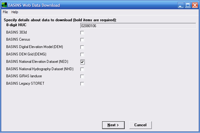Additional data (e.g., DEM) can also be downloaded using the Web Data Download tool. To use this tool select 'File >> Download Data'. The BASINS Web Data Download dialog will appear allowing the user to select which general data type they would like to download. To download DEM data, ensure that the top check box is selected, as shown below, and select "Next".