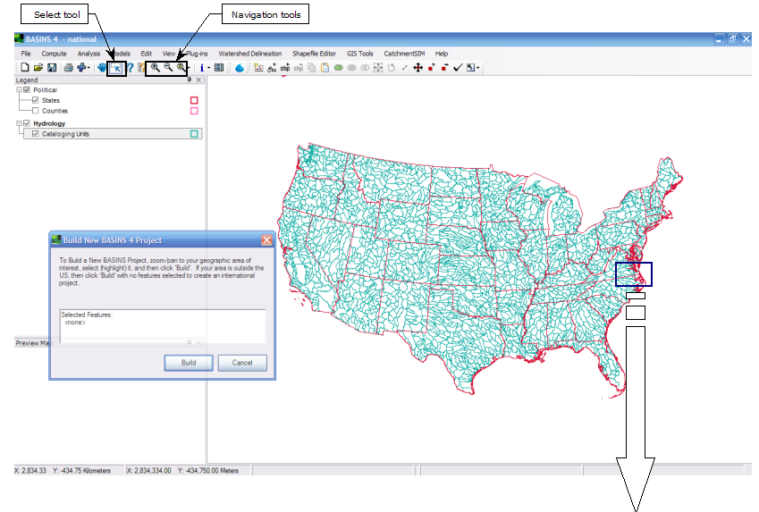 To use the BASINS automated download facility, you must first setup a new project. In BASINS select 'File >> New'. A GIS map of the United States will appear in the main BASINS window along with state boundaries (maroon lines) county boundaries (de-selected by default) and hydrologic unit boundaries (turquoise lines), as shown below. You must use this map to define your study area by selecting a hydrologic unit.