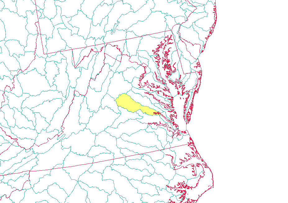 As an example, we will use the Pamunkey River, which drains to Chesapeake Bay in eastern Virginia. Zoom to the area shown on the map below using the 'navigation tools'. Once you have located the Pamunkey River watershed, use the 'select tool' to select the hydrologic unit. "02020106 : Pamunkey. Virginia" should now be included in the 'Selected Features' section of the 'Build New BASINS 4 Project' dialog.