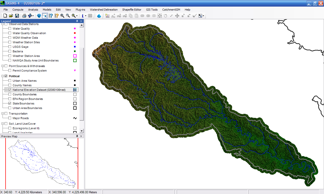 Select the 'BASINS National Elevation Dataset (NED)' check box and click the 'Next' button . The NED DEM will be downloaded, extracted and will be displayed over the existing BASINS layers. The BASINS window should look similar to the following after adjusting the order of the data layers.