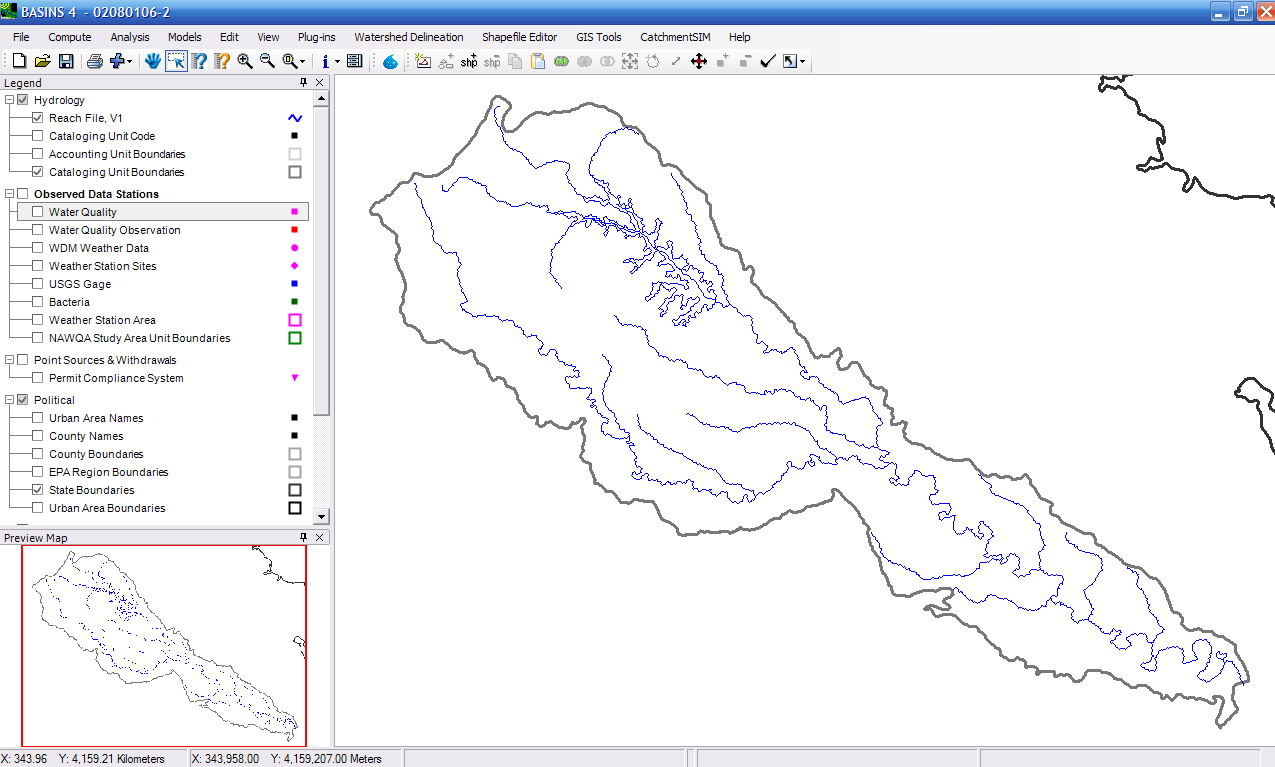 Basins has downloaded a range of data and has automatically incorporated this data into the BASINS project. Not all data layers are shown by default. Data that is downloaded by default that can be used within CatchmentSIM includes a STASGO soil layer and a watercourse/stream layer.