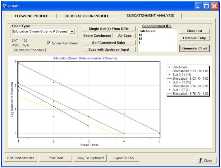 | Note: | The checkbox labelled Ignore Main Stream is included for analysis of subcatchments as apposed to the catchment as a whole. If you are analysing a subcatchment with upstream inputs the main stream(s) actually continues from upstream subcatchments, hence using stream drop, stream order, or stream length parameters for this stream is not appropriate. This checkbox is available in the Bifurcation, Cum Stream Length vs Order, Stream Drop vs Stream Order and Threshold Area Comparison charts. |