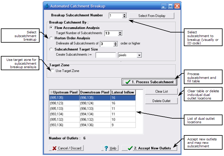 When using the subcatchment target size algorithm (Subcatchments >> Breakup Subcatchment), the user designates a target subcatchment size. The algorithm will automatically breakup the catchment into the number of subcatchments necessary to meet the target subcatchment size.