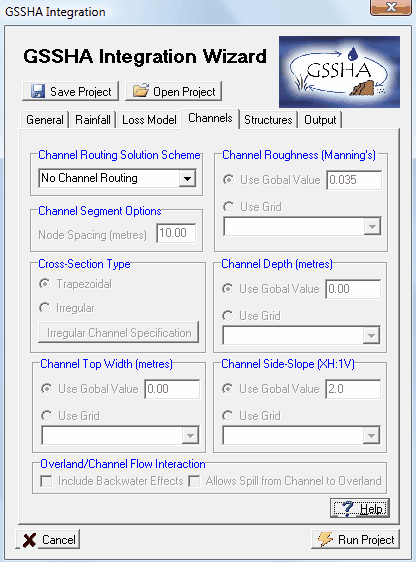 The 'Channels' tab is used to specify the characteristics of the 1-dimensional stream channel network across your study area.