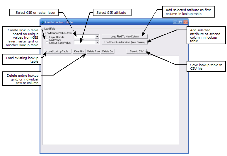 To create a lookup table, you must first select a GIS or raster gird layer attribute or a column from another lookup table by using the radio button and drop down boxes on the top left of the form. Once you click the "Load Field To New Column" button, all unique values from the selected GIS layer, raster layer or lookup table column will be added as a new column on the left hand side of the main table. To remove a row or column at any stage, select the row or column and click the "Delete Row" or "Delete Column" button.
