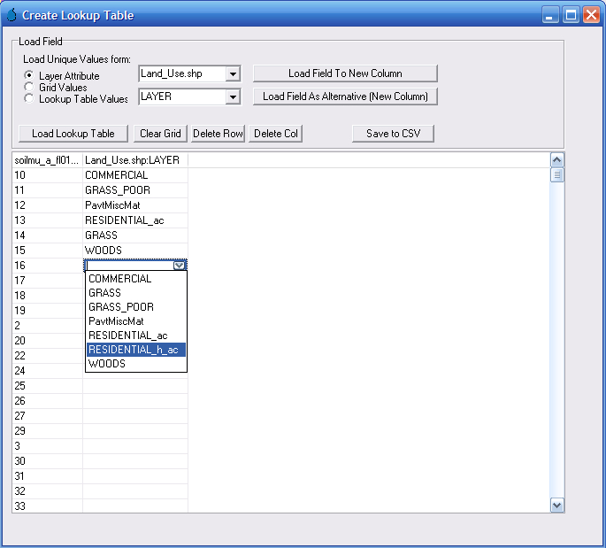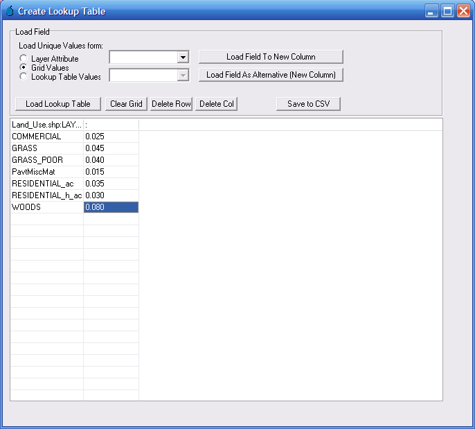 Next 'lookup' values must be assigned to each unique category. If you would like to specify values that are independent of any other layers or lookup tables (e.g., if you would like to assign Manning's 'n' roughness values to land use categories), click the "Load Field as Alternative (New Column)" button but ensure that no layers are selected in either of the drop down boxes. This will add a new blank column. The manning's 'n' roughness values can then be input next to each land use category (refer below).