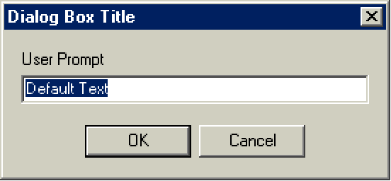 InputQueryBox ( Result Variable , User Prompt , Dialog Box Title , Default Text )