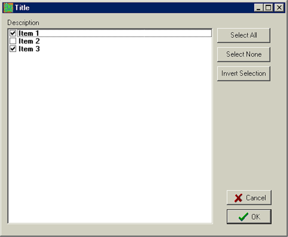 This example was the code used to generate the screen capture illustrated above. The DisplayCheckListBox procedure would have created the array variable &ArrayCLBResults, set its length to two and stored Item 1 and Item 2 in the array since these were the items that were checked. However, the user could have changed the items that were checked before clicking OK and this would effect the length and content of the &ArrayCLBResults array variable.