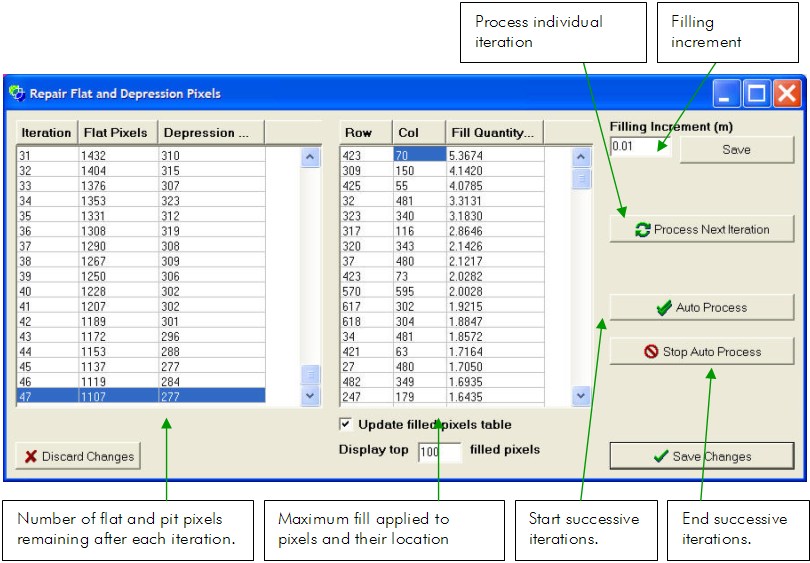 This tool applies an iterative filling algorithm to first fill pit pixels to the elevation of their lowest neighbour and then raise all flat pixels by a set Filling Increment. This process is repeated as many times as required. The algorithm is particularly useful for application after a DEM has been interpolated using CatchmentSIM to treat flattened hill crests as illustrated in the algorithm section. If flat and pit pixels are from an external DEM then the breaching algorithm may be a more appropriate algorithm. The breaching algorithm is also useful to treat the final flat and pits pixels left over from the filling algorithm. More information regarding removing flat and pit pixels can be found in the algorithm section or the Key Challenges section.