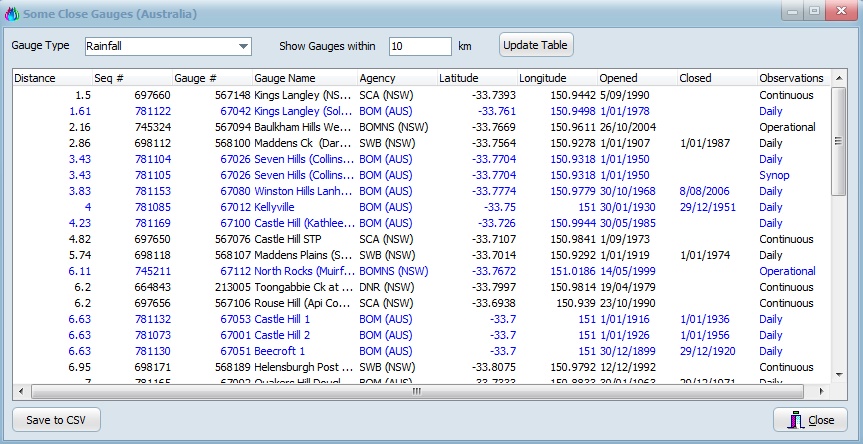 Those rows in the table with blue text are gauges with data that is already incorporated in the Rainfall Analyser while those rows with black text correspond to gauges with data that is yet to be imported into the Rainfall Analyser. Data for daily rain gauges that is not already imported into the Rainfall Analyser can be automatically downloaded and imported (refer following section).