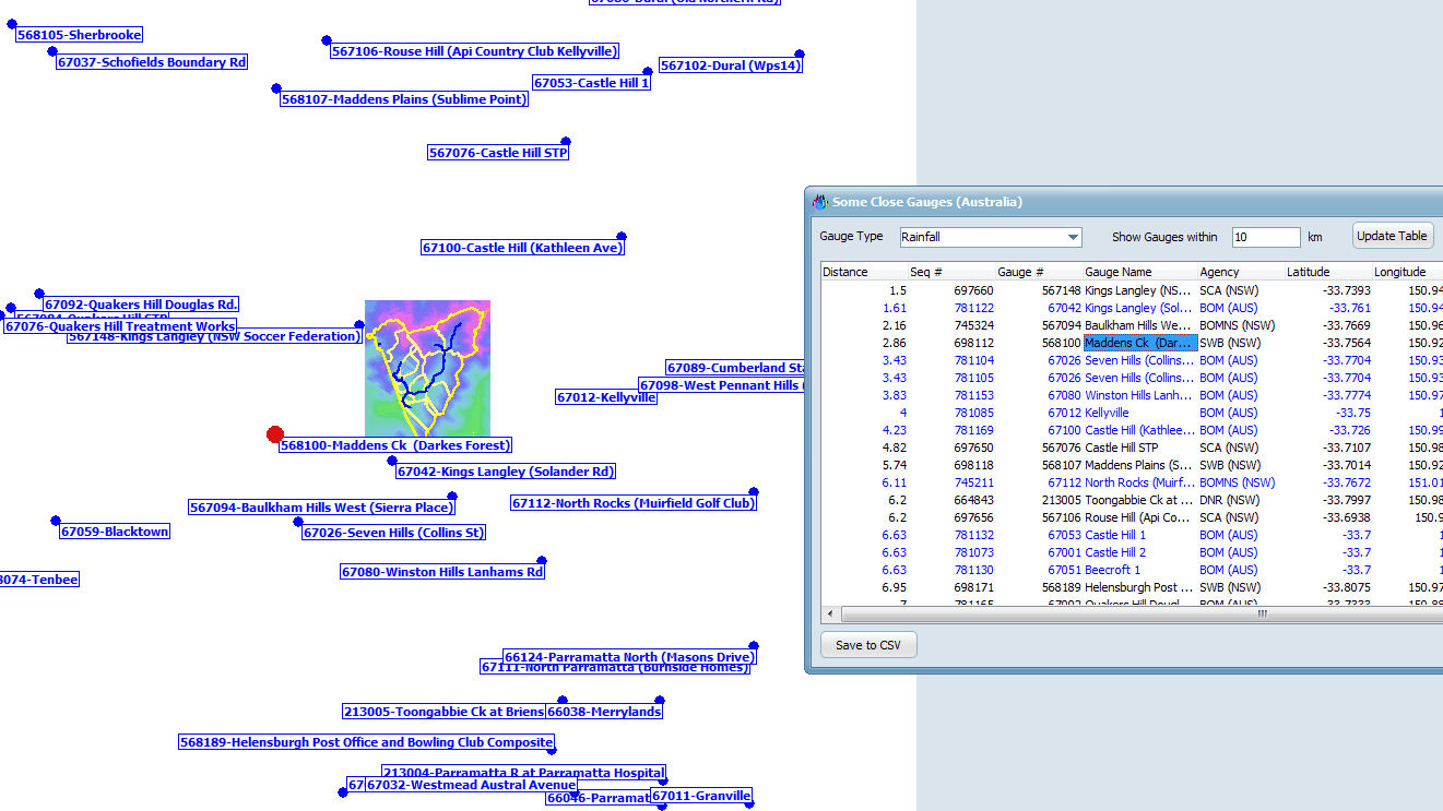 The main CatchmentSIM display will also be updated to display the location of all gauges displayed in the table as a series of blue "dots". The location of a specific gauge can be identified by clicking on the appropriate row in the table. The selected gauge will be highlighted in the main CatchmentSIM display as a larger red "dot". Note that the display of gauge locations is temporary only and will be removed once the 'Find Nearby Gauges' dialog is closed.