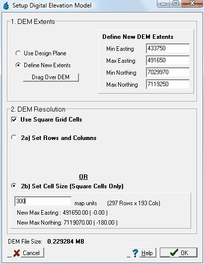 To setup a new blank DEM, select Create DEM >> Setup Blank DEM. Specify a square grid size of 300 metres, as shown below. This will create a blank DEM where each grid cell measures 300 x 300 metres in size.
