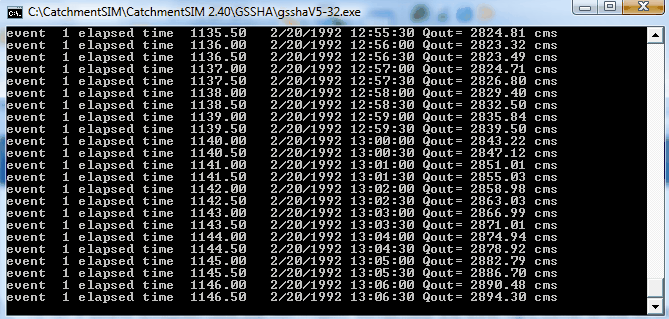 The DOS window summarises the current time step being simulated and the discharge at the catchment outlet for each time step as the calculations are being performed.