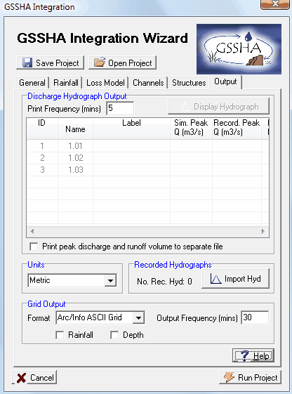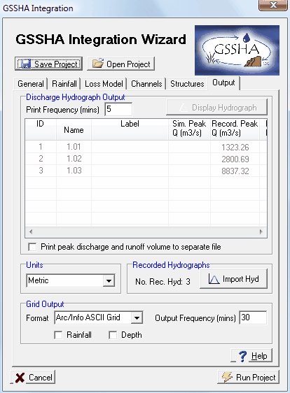 Click 'OK' to return to the 'Output' page of the GSSHA interface. You should find that the 'No. Rec. Hydrographs' in the 'Recorded Hydrographs' section of the page has been updated to '3' to show that we have added three recorded hydrographs to the project. You should also see that the table in the middle of the page has been updated to include information extracted from the recorded hydrographs, included recorded peak discharge, time of peak and recorded runoff volume.