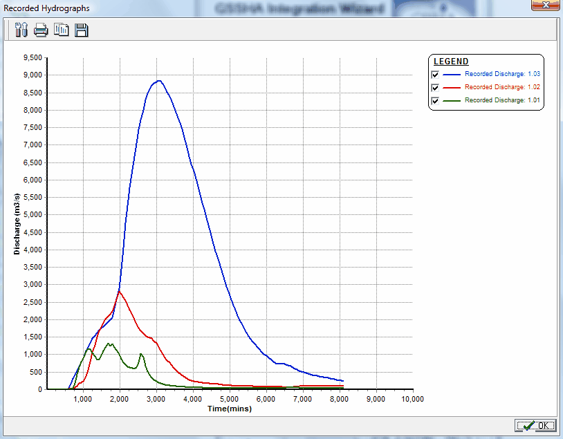 ' button. As shown below, all three hydrographs can be displayed simultaneously in this chart by ensuring all are checked in the Legend):