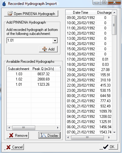 To add a recorded hydrograph to our project, click the 'Open PINEENA Hydrograph' button and navigate to the 'StreamflowData' directory. Select the 'Gympie.CSV' file (this contains the recorded 1992 hydrograph for the stream gauge at the very downstream end of our project). Now we need to assign this hydrograph to the appropriate subcatchment in our CatchmentSIM project. As discussed, this hydrograph belongs to the downstream most stream gauge, which corresponds to subcatchment '1.03'. Select '1.03' from the drop down box in the 'Add PINEENA Hydrograph' section of the page and the hydrograph should then appear in the 'Available Recorded Hydrographs' section.