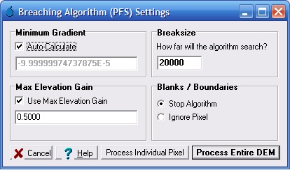 Sink prescreening can be completed using the Breaching Algorithm with a small 'Max Elevation Gain' (e.g., 0.15 metres or 0.5 feet), as shown below.