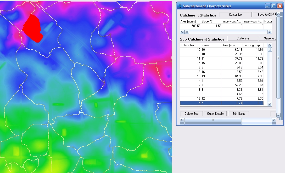 The resultant basin boundaries are shown below. A review of the subcatchment manager verifies that only basins with a drainage area of greater than 1 acre and a ponding depth of greater than 2 feet have been retained.