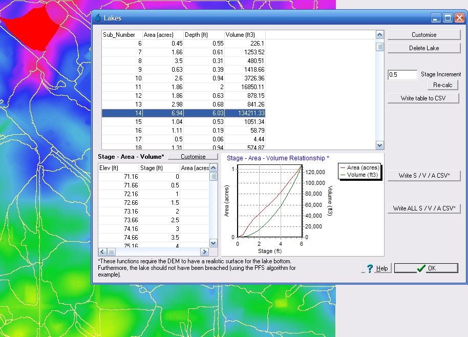 and ensure that Area, Ponding Depth and Volume and selected, as shown below. The Lakes Database allows you to interactively select a drainage basin and view the location of the drainage basin in the CatchmentSIM plan view. Review which basins you would like to retain and which should be eliminated and record the associated characteristics (i.e., drainage area, storage volume & maximum ponding depth). Evaluate the outcomes of this review to determine if there are one or more of the criteria that can be used in isolation or in combination to distinguish between actual sinks and depressions that should be removed.