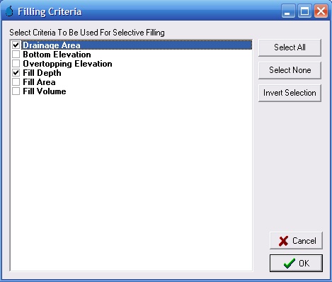 After you select "Run Macro" a check box list will open asking which criteria you would like to use select which pit to fill. For example, if you wanted to fill unwanted pit pixels based on a user define drainage area and fill (i.e., ponding) depth, the dialog box should look similar to that shown below.