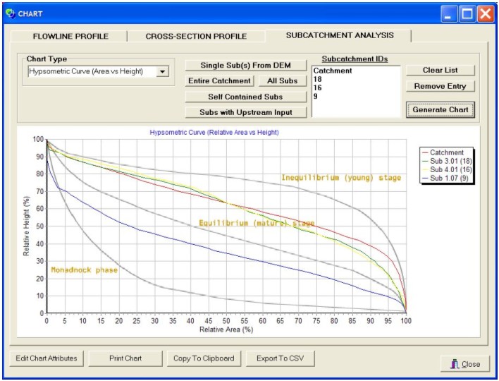 The hypsometric curve chart provides a measure of the geomorphologic state of the subcatchment. Horton observed that subcatchments in different state of their geomorphological evolution had different relative height vs relative area relationships. This chart includes a background picture illustrating Horton's hypsometric profiles.