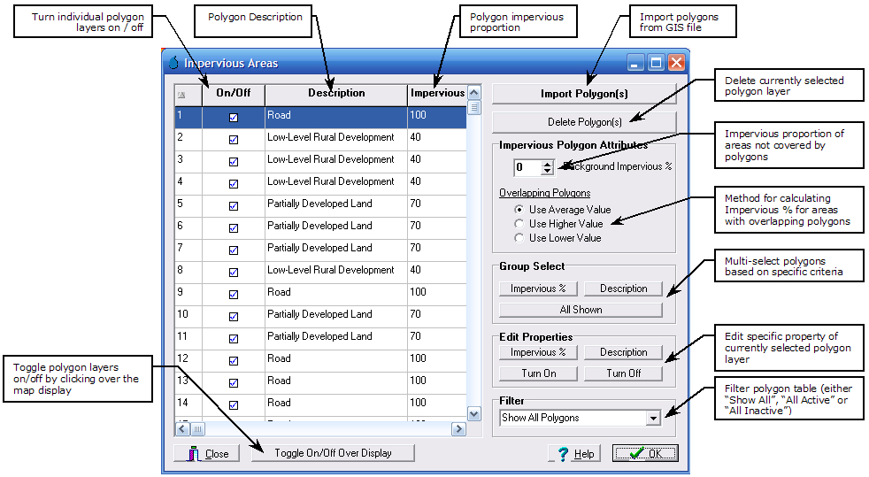 Impervious area polygons can be deleted by individual or group selection and then clicking the Delete Polygon(s) button. Deleting polygons should only be used when polygons are to be permanently deleted, otherwise turning them off may be preferred.