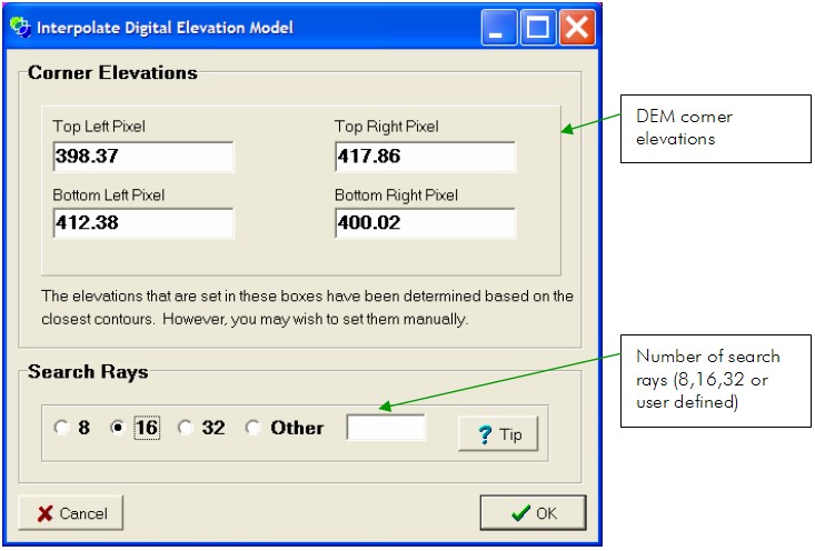 | Note: | The DEM interpolation algorithm will only derive elevations for blank DEM pixels. Therefore it can be used to fill in missing data in imported / sampled DEMs. |