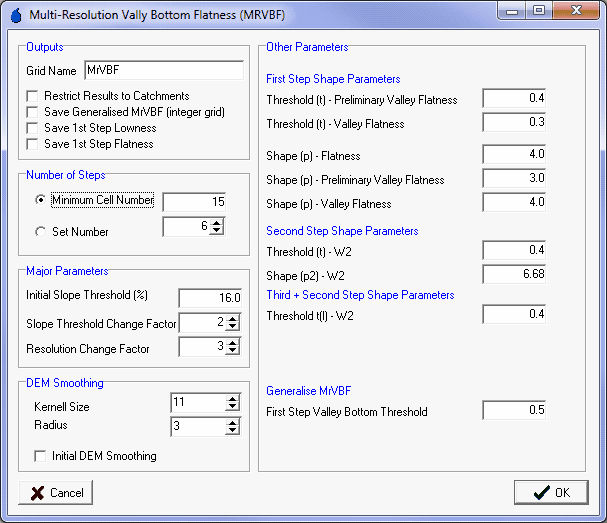 CatchmentSIM’s implementation of the MrVBF algorithm allows adjustment of many of the minor parameters involved with the method. These mainly consist of the shape and threshold parameters associated with the non-linear transformation applied at several points within the method. The First Step Valley Bottom Threshold parameter is only used in conjunction with the ‘Save Generalised MrVBF (integer grid)’ option and reflects the threshold between flat and non-flat areas for the 1st Step (Non Defined and ‘1’ values in the generalised integer grid).