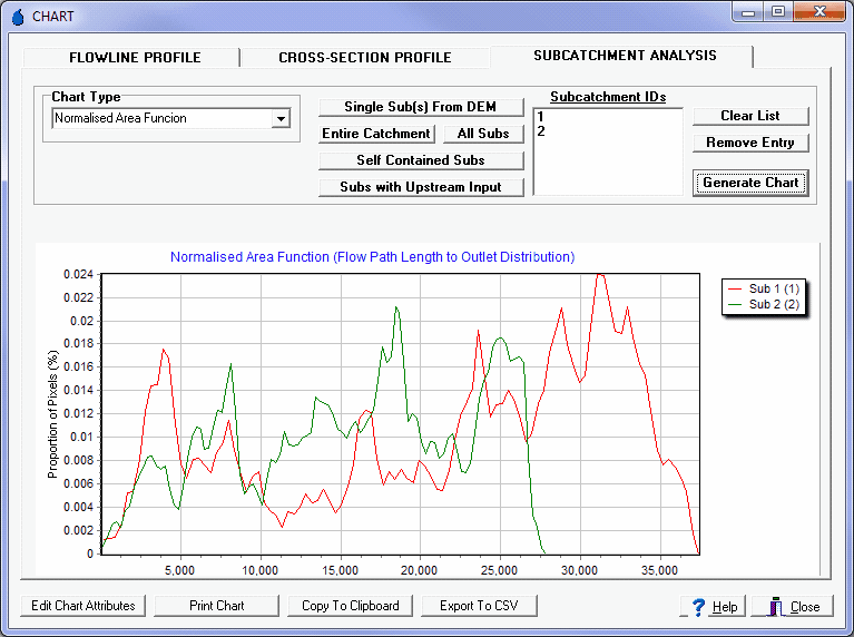 The Normalised Area Function is usually represented by a chart of flow path length vs probability and can be parameterised by mean flow path length, maximum flow path length and flow path length variance or standard deviation. An example Normalised Area Function for two subcatchments is presented below.