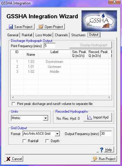 To add the recorded discharge hydrograph(s) to the GSSHA project, select the '