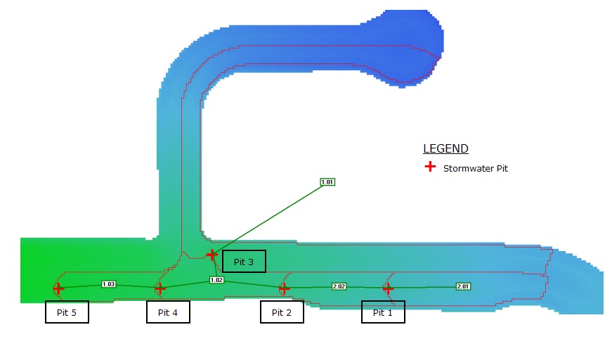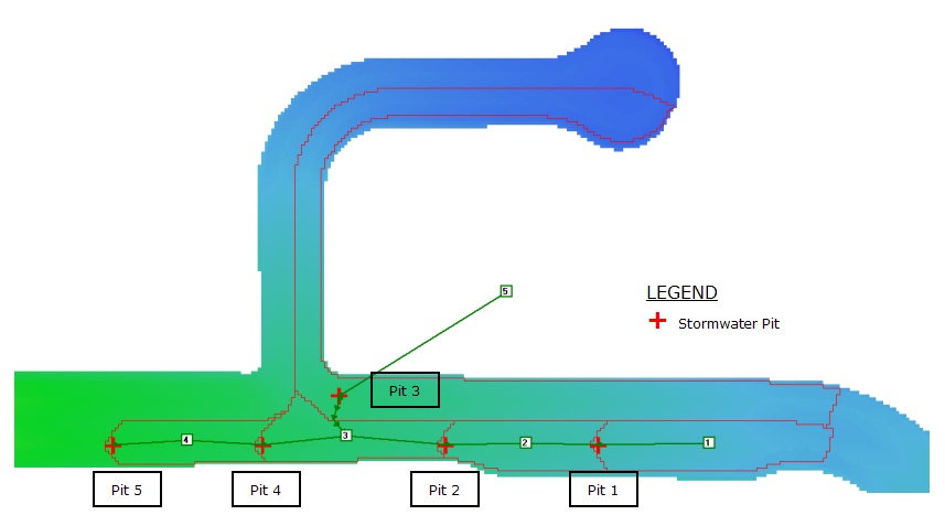 The Pit Algorithm removes flat and pits pixels from the vast majority of the DEM, however, retains any localised depressions that would require an excessive amount of 'cutting'. As shown in the image below, application of the Pit Algorithm retains the sag pit and provides a more reliable subcatchment boundary for Pit 3. The image also illustrates that the subcatchment draining to Pit 3 is only hydrologically linked to the adjoining subcatchment via an overland flow path (illustrated by the green arrow heads).