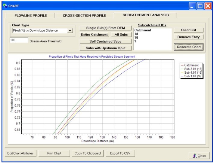 This chart plots distance vs the proportion of pixels within a subcatchment that will have reached a raster stream pixel by the time they have travel such a distance. Thus, as distance increases, pixels (%) will approach 1 (100%). This chart illustrates how rapidly a subcatchment can be drained. For example, the chart below indicates that after 120m of flow path, flow from 78% of pixels from subcatchment 1.07 will be 'in-stream' whereas 82% of pixels from subcatchment 3.01 will be 'in stream'. This (considered in conjunction with slope and land use can help assign relevant runoff routing parameter in subsequent rainfall runoff models.
