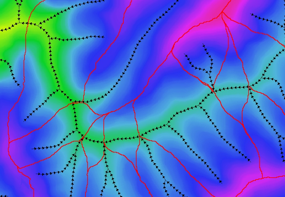 This display is designed to aid in preparation to ensure the enforce drainage direction algorithm can operate successfully. If the displayed drainage directions are not correct then the terrain underneath the stream segment may need to be modified by ensuring the pixel elevation under the downstream end is lower than that under the upstream end.