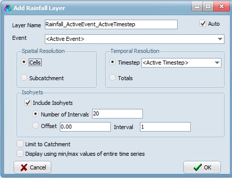 •Layer Name: Allows the user to specify a name for the new time series layer. This name will appear within the Layer Controller layer list. If the 'Auto' check box is selected, a name will be automatically assigned based on the event name (as defined on the Events tab of the Rainfall Analyser) and the event time step.