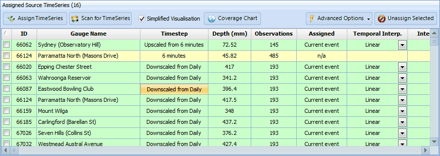 All available rain gauges will be displayed within the 'Assigned Source Time Series' table. However, only those gauges that have been assigned to the event (highlighted in green below) will be used in the rainfall event calculations. Unassigned gauges will be highlighted in yellow.