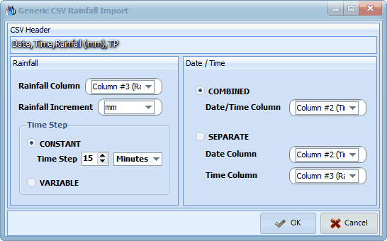 •Start Date/Time: the start date and time for the historic event. Care should be taken in defining the start time, particularly when using daily rainfall data. Daily rainfall totals are typically read at 9am each day. Therefore, a start time of 9:00am would be appropriate to ensure daily rainfall totals are conserved across the event.