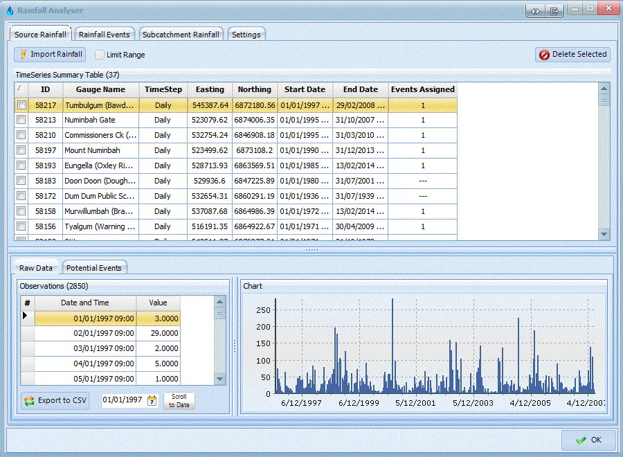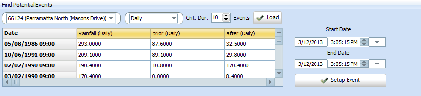 It is often necessary to select one or more discrete historic rainfall events for the purposes of calibrating a hydrologic model or simulating a specific historic event. The 'Potential Events' tab can be used to assist in the selection of significant historic rainfall events. To use the 'Potential Events' feature, it is first necessary to select an appropriate gauge for the analysis. This gauge should ideally have a long record (refer start and end dates in the 'Time Series Summary Table') and be located within or in close proximity to the catchment of interest.