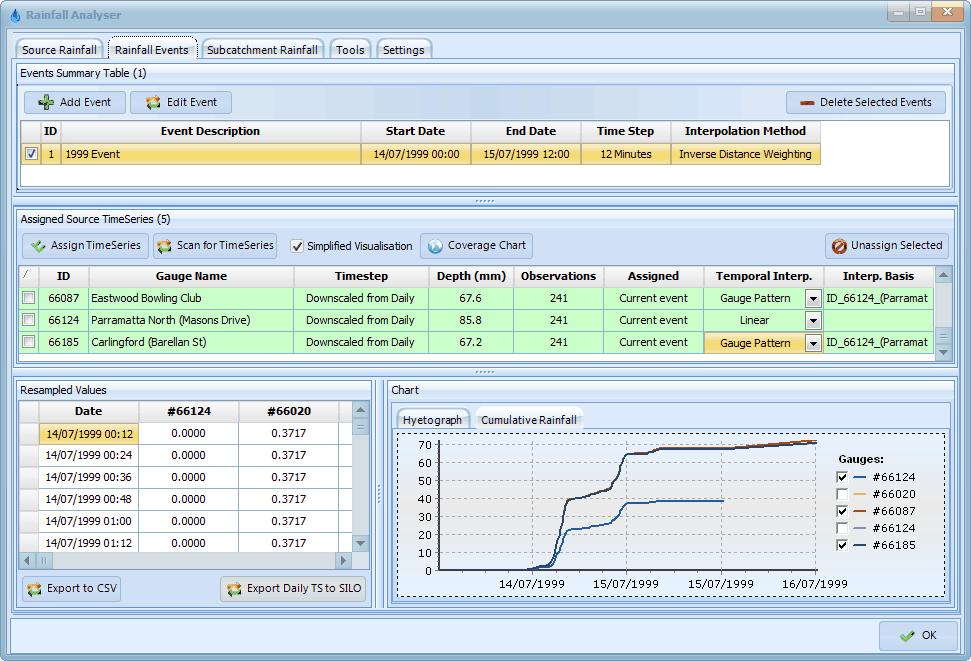 Once all gauges have been re-sampled to the selected event time step, the re-sampled data can be viewed in the 'Resampled Value' table. The re-sampled data can also be exported to CSV: