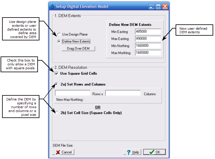 | Note: | If you setup a DEM after one has already been created then the original DEM and all derived grid layers will be removed. To create a new blank DEM while retaining any grid layers, use the Reset Existing DEM menu item. |