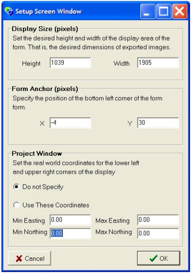 The setup display window menu option allows the user to precisely setup the CatchmentSIM window size and location by specifying its height, width, anchor points as well as the zoom characteristics by setting the extents of the visual part of the project.