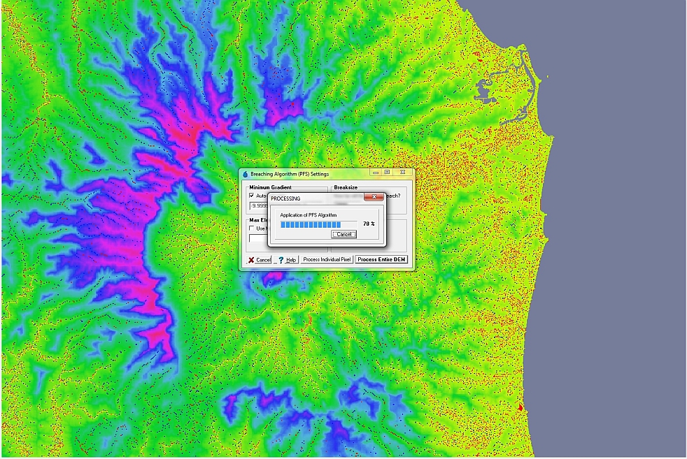 An inherit problem of raw DEMs is the fact that they are not instantly in a suitable condition to describe the flowpaths that exist across an area of interest. The major limitation that exists lies with "flat and pit" pixels. These pixels have an elevation the same as, or lower than, adjacent pixels, causing localised "sinks". This damages the flow connectivity and will ultimately result in unreliable flowpaths, stream and catchments. This is typically a result of "noise" in the input DEM information (e.g., vegetation).