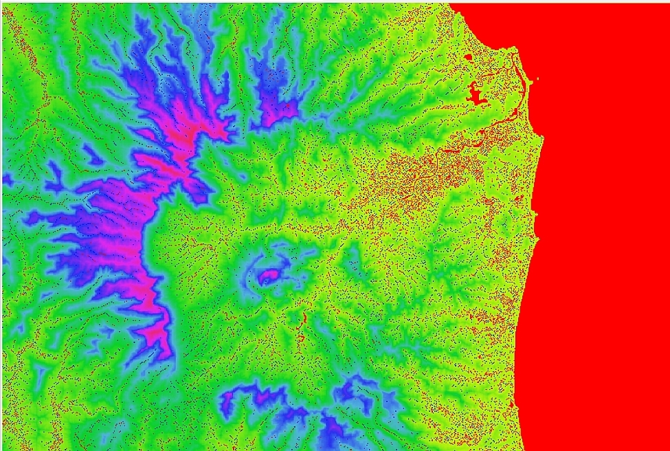 An image of the flat and pit pixels in our current project is shown below. Blue pixels indicate pits (pixels lower than adjacent pixels), and red indicates flat pixels (pixels with the same elevation as adjacent pixels). As can be seen, the majority of flats and pits are located along lower areas of the DEM (ie: where watercourses would lie), and the majority of flat pixels exist where the ocean/river would be expected.