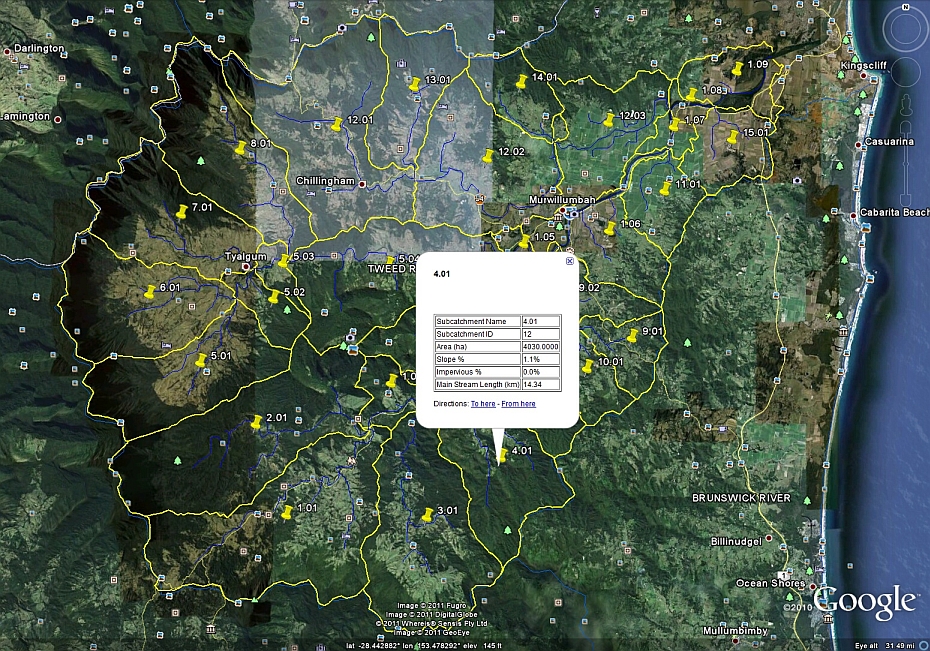 As shown below, the subcatchments and streams are superimposed on the Google Earth background. You can interrogate a subcatchment in Google Earth by simply clicking on the push-pins located at the centroid of the subcatchments, as shown below.
