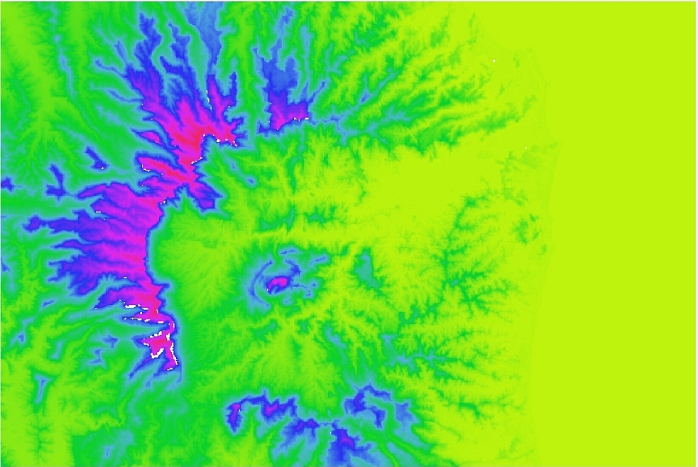 Now we will use the ocean polygon to lower the DEM cells below the ocean. This will help us condition the DEM by ensuring the ocean is the lowest point in our DEM. Select "DEM Conditioning >> Ocean >> Set Ocean Elevation". Enter a value of -10. The resulting DEM should look similar to that shown below.