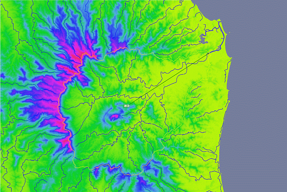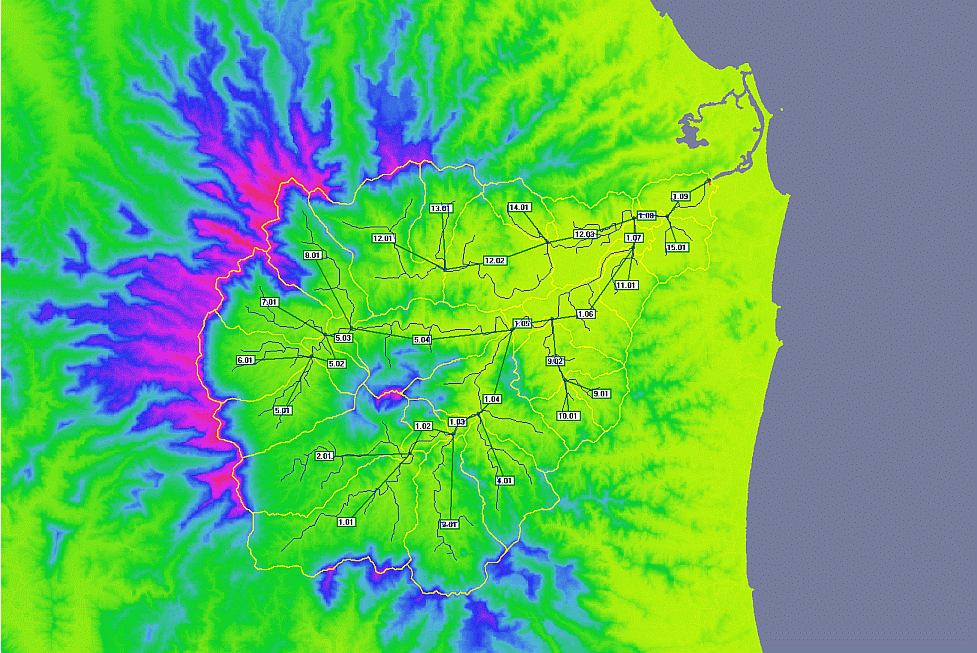 Now we have defined an outlet for our catchment (the Tweed River). We will now get CatchmentSIM to map the catchment draining to this outlet by selecting "Subcatchments >> Map All". This is most time consuming algorithm as it needs to maps the path of flow from every pixel within the DEM to see which pixels ultimately drain through the outlet line that we have drawn.