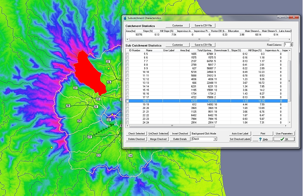 CatchmentSIM will automatically calculate a range of hydrologic properties for each subcatchment, including area, stream lengths, slopes. To view the subcatchment properties select "Subcatchments >> Subcatchment Manager". If you select a row in the subcatchment manager, the corresponding subcatchment will be highlighted in the main CatchmentSIM window.